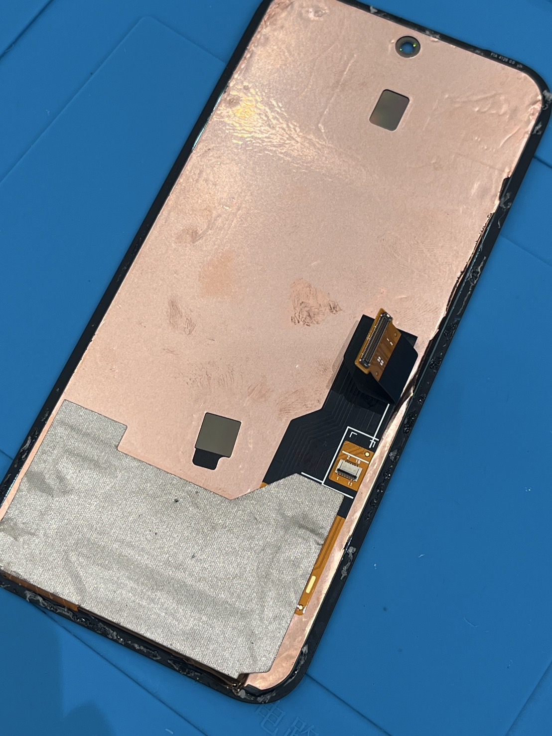 再び液晶を温めて指紋センサーのケーブルを取り外して、新しいパネルに移植します。