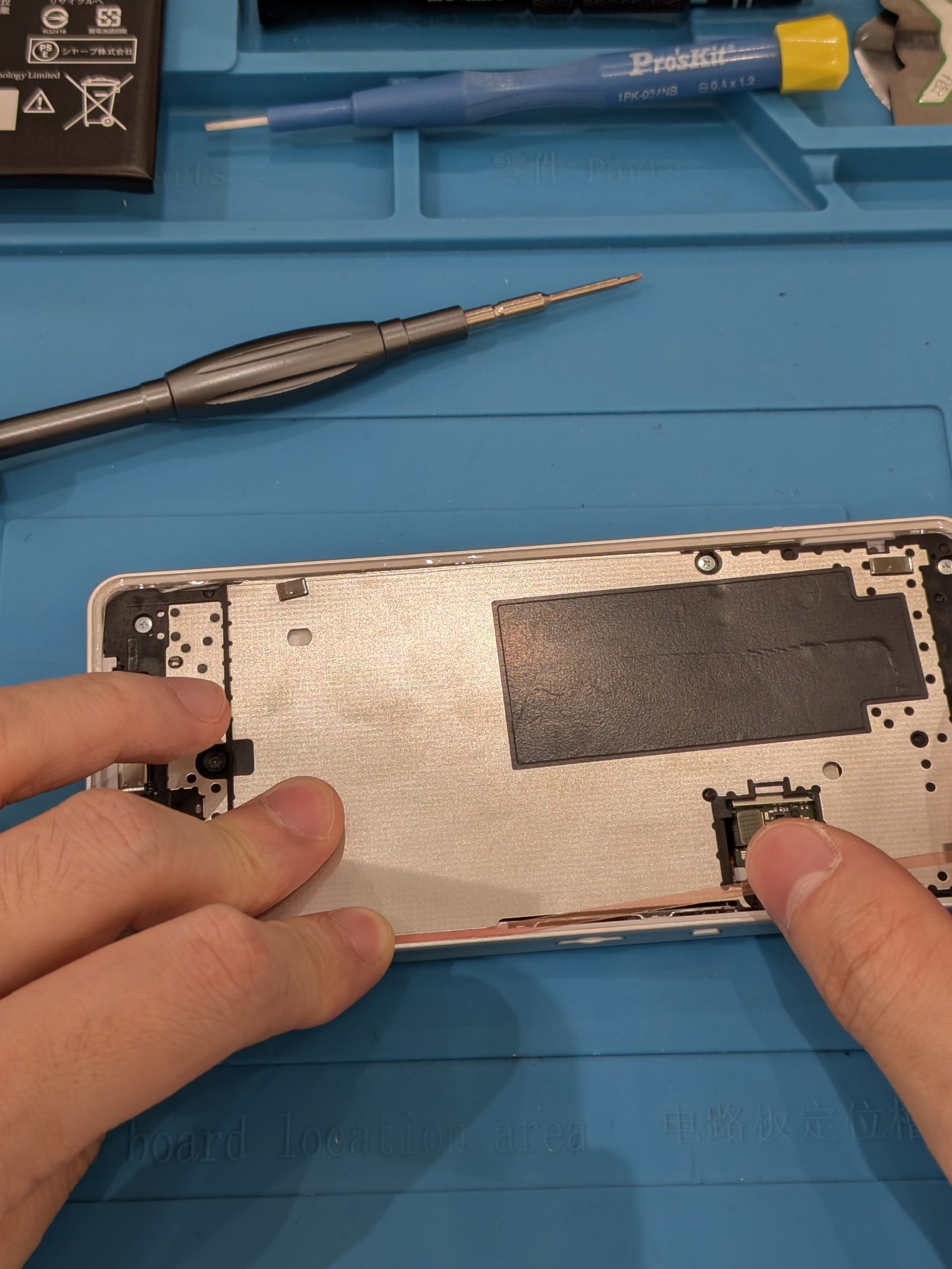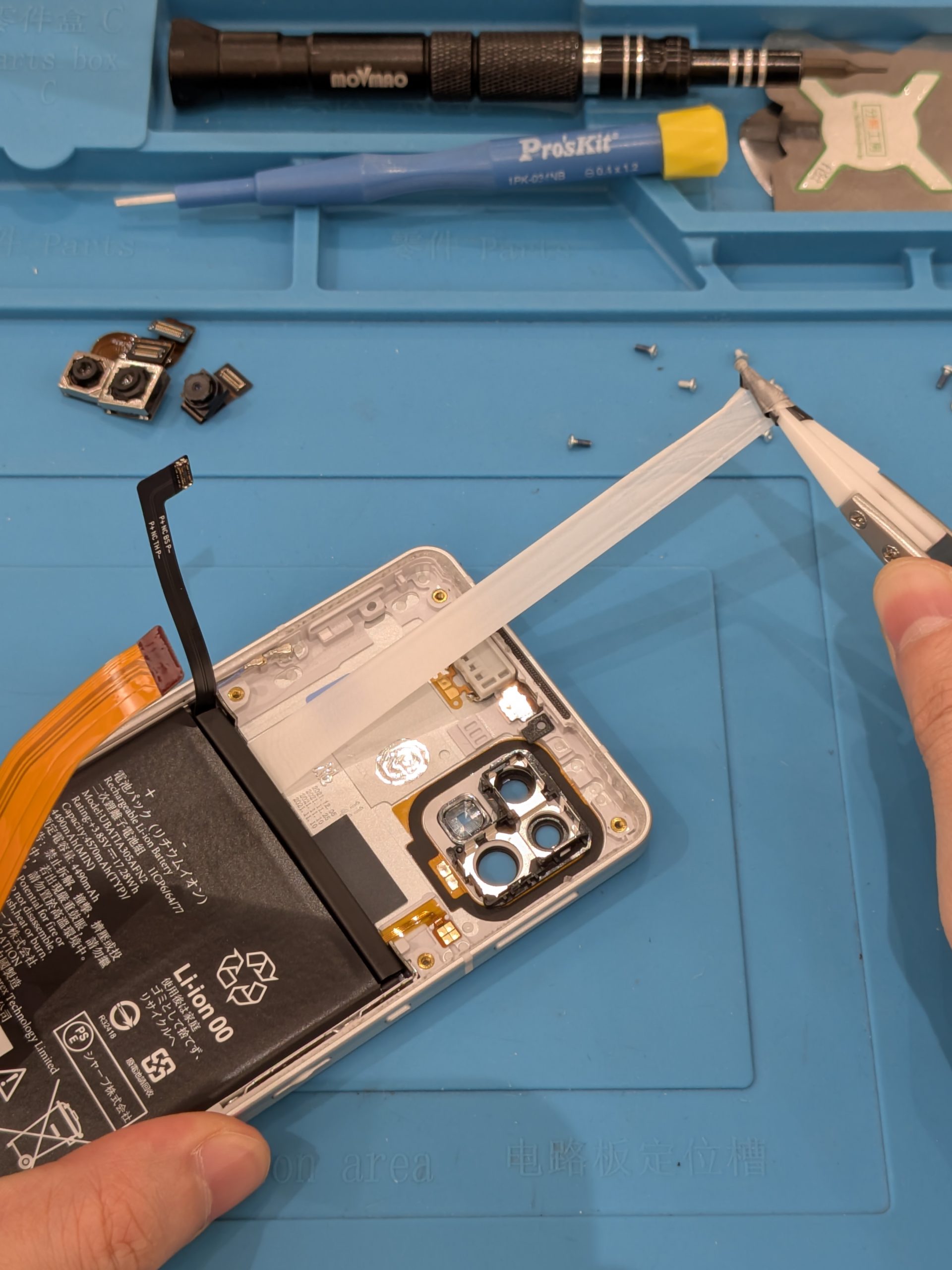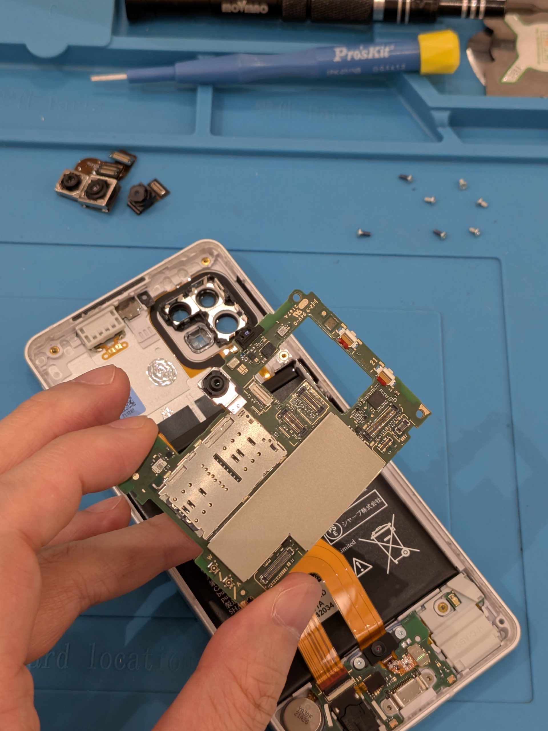 SIMカードトレイと背面カメラを外した後に基盤を取り外します。