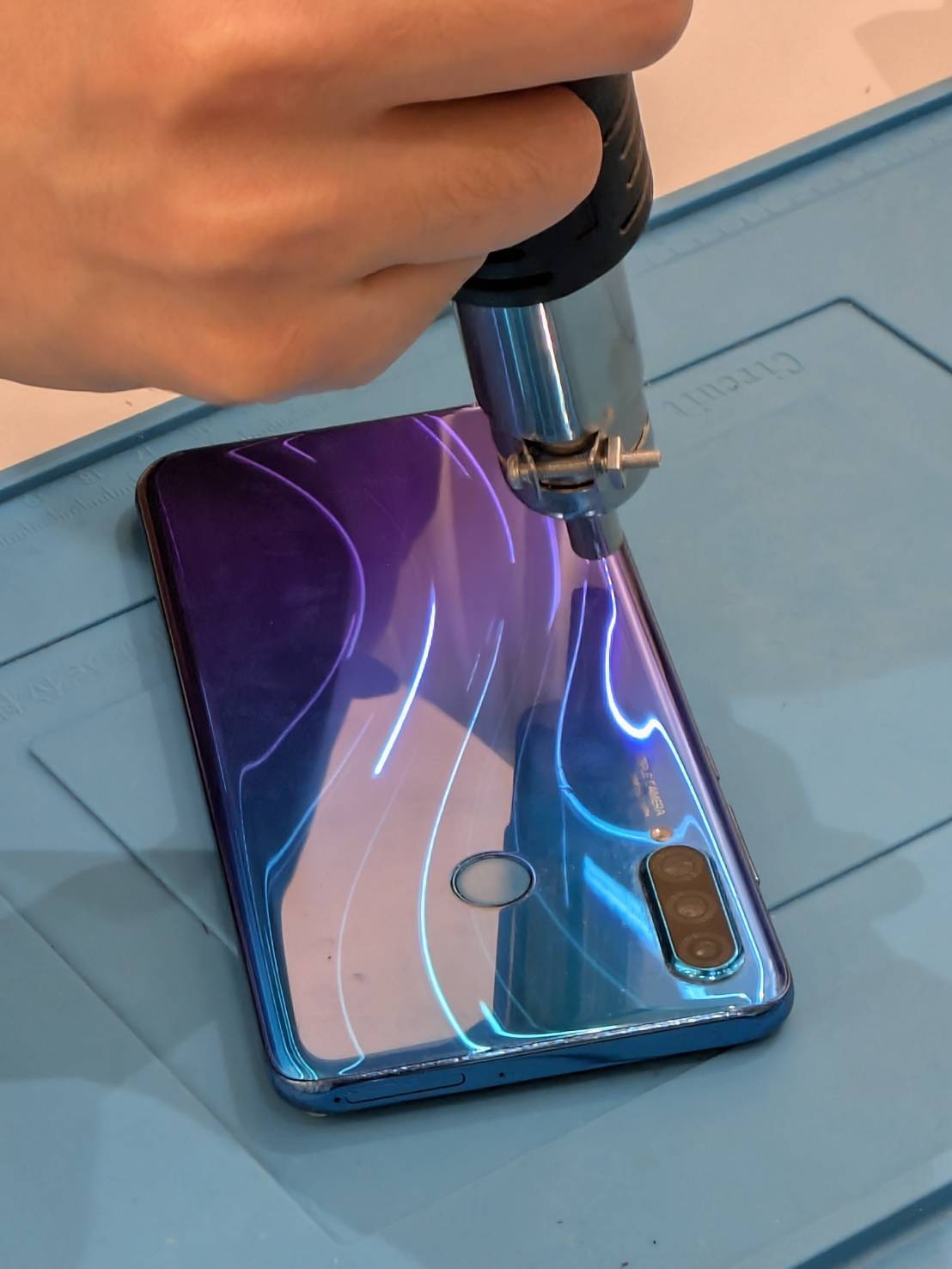 こちらの機種は背面開けとなるのでヒートガンで縁を温めて粘着剤を弱めます。