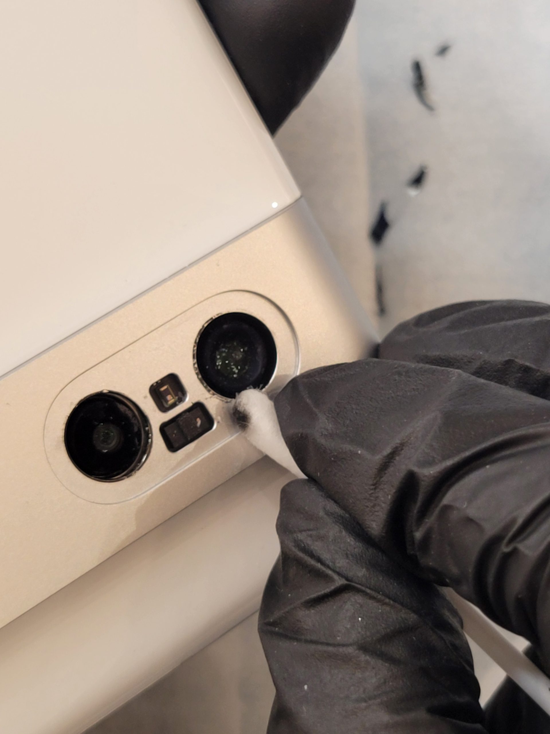エアダスターで中に入ったごみやガラス片を取り除いたら新しいカメラレンズを貼り付けます。