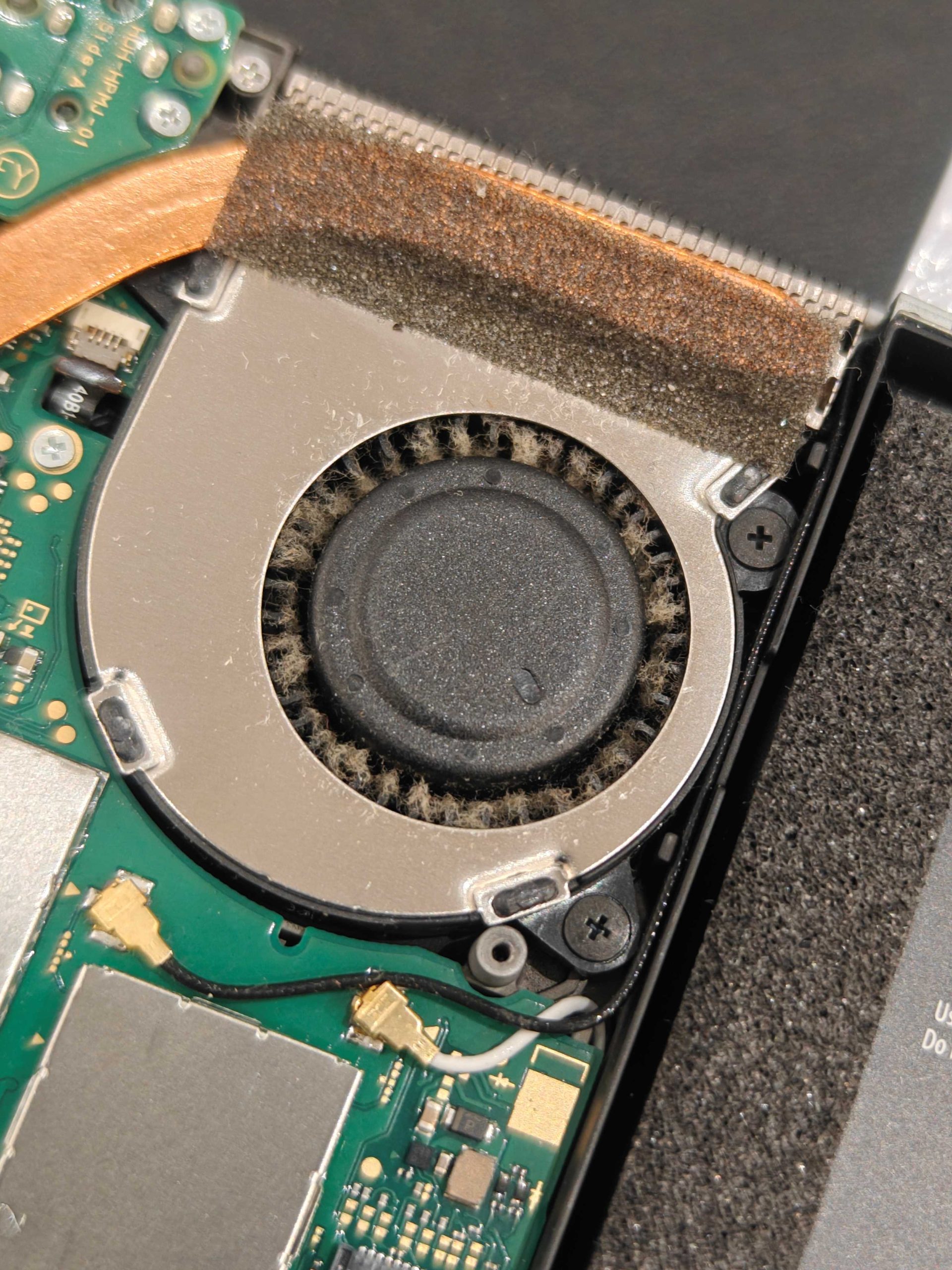 こうした汚れはファンの故障やその他のパーツの故障に繋がるので後ほどパーツを全部外した際に綺麗に取り除いていきます。