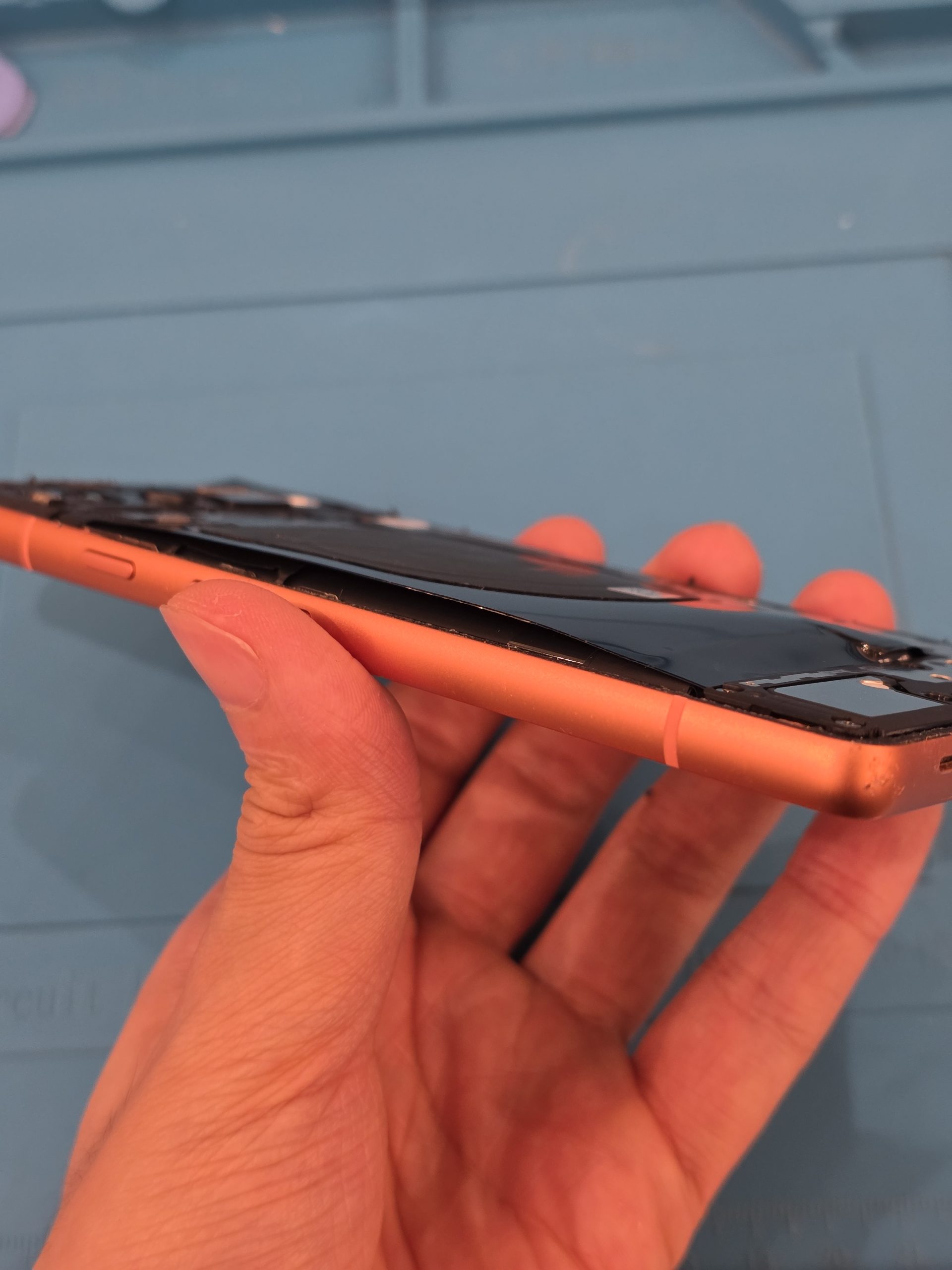 今回ご依頼の端末は背面から分解していきますので、事前に背面側を温めておき工具を挿してパネルを剥がします。