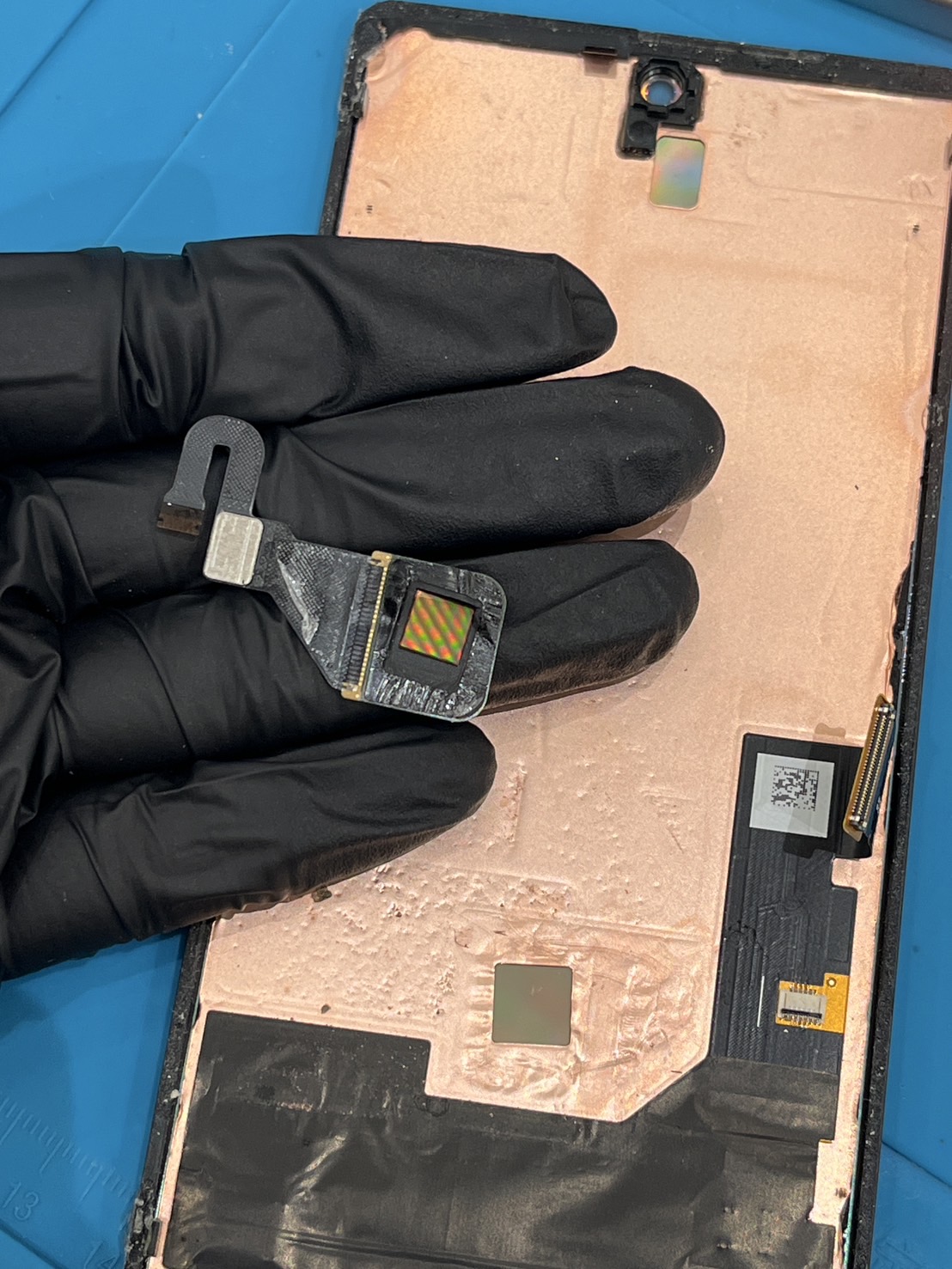 古い方のパネルに付いた指紋センサーを慎重に取り外します。